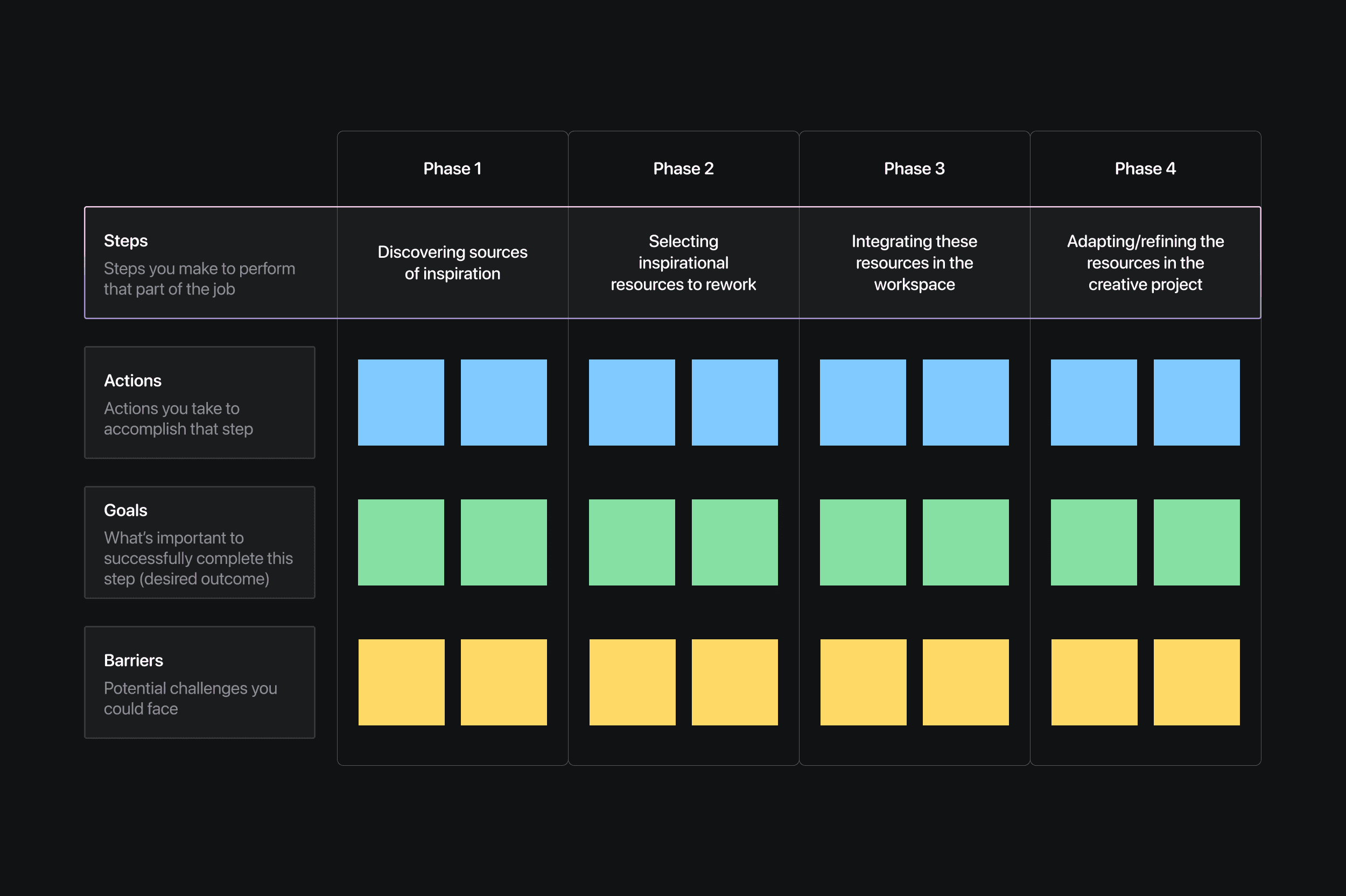 For the first stage of my capstone, I began by clarifying the problem space and narrowing in my customer persona: early-career designers with less than four years of experience using vector-based tools like Adobe XD, InVision, and Sketch. Using the Jobs-to-be-Done framework, I focused on their core job—conceptualizing creative projects—and audited the current Figma Community experience to uncover potential friction points along that journey.