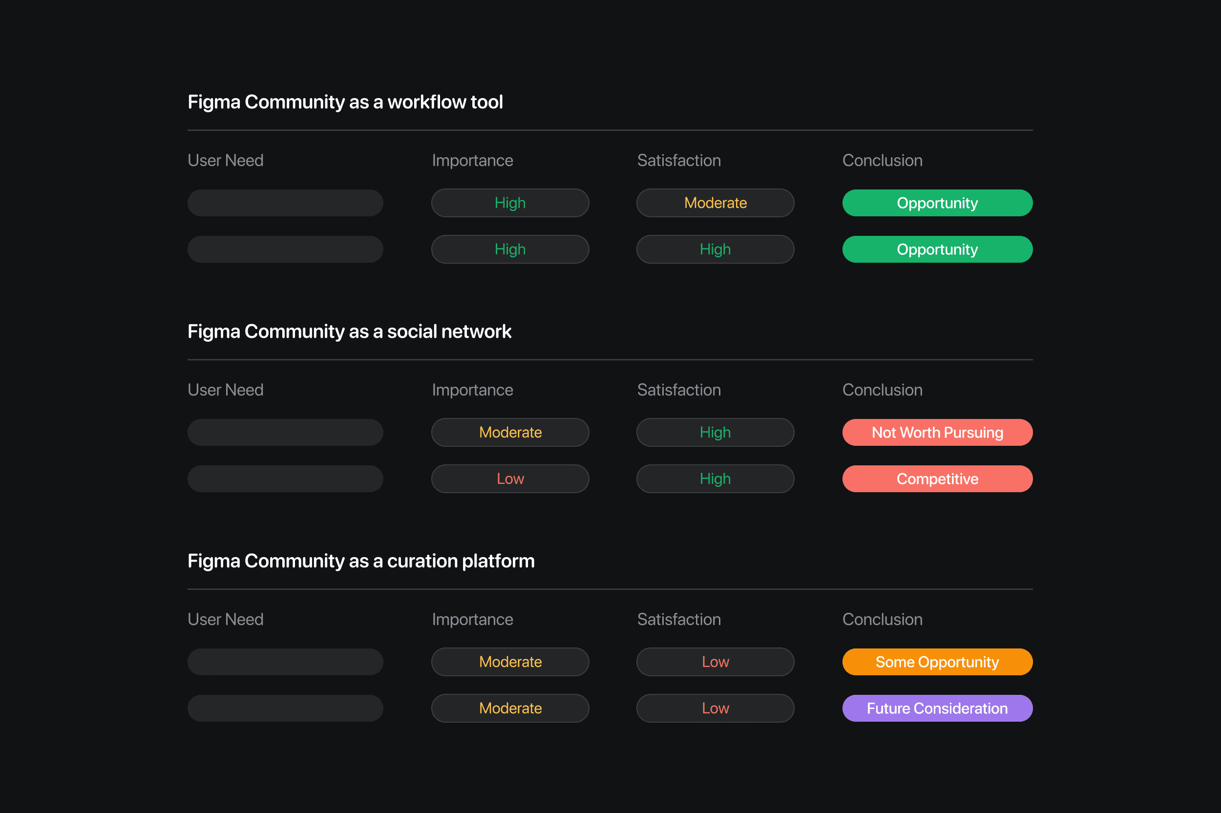 I started by pulling a list of needs from my updated job map into a matrix that assessed (a) how important the need was, and (b) how well current solutions were addressing it. This exercise helped me distinguish potential opportunities from crowded or low-impact ideas. Through this process, I zeroed in on a set of high-priority, underserved needs, positioning Figma Community as a tool better suited to support the design workflow over use cases like content curation or social networking.